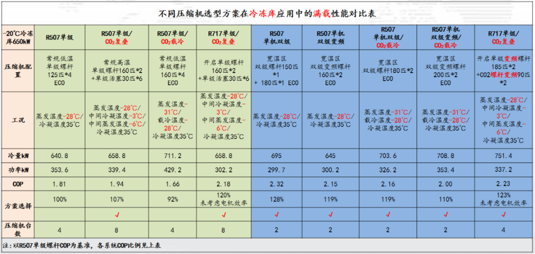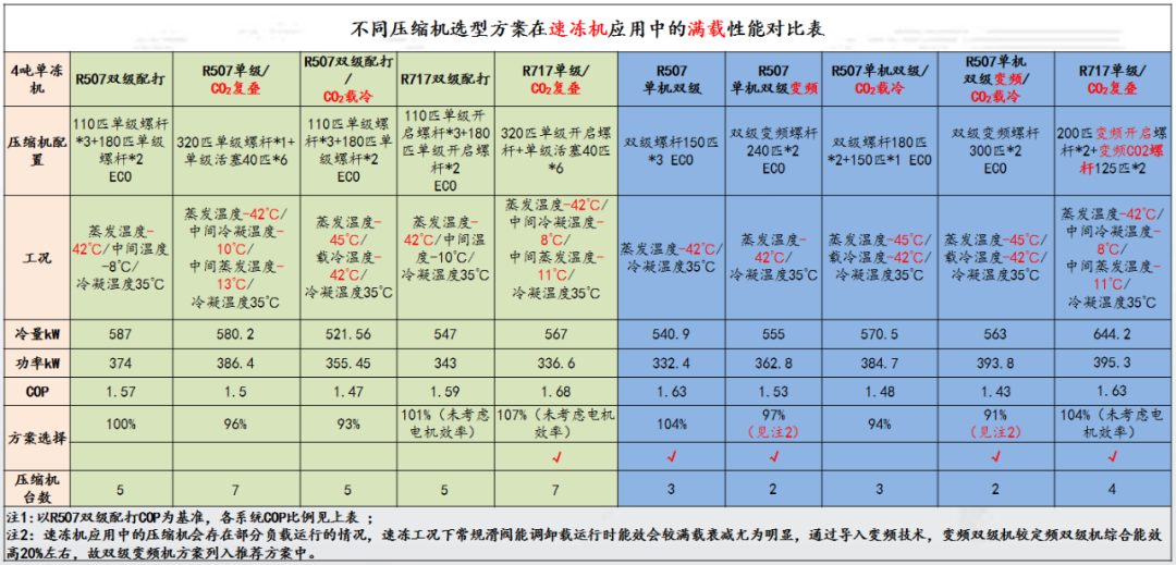 ? ?除了上述采用高效節能設備來減少間接碳排放量的方式外,還可以結合使用自然工質來減少系統中氟利昂的充注量,從而減少制冷系統意外泄漏后的造成的直接碳排放量。下表為純氟系統以及自然工質系統中不同壓縮機選型方案在冷凍庫、速凍機應用中的對比: