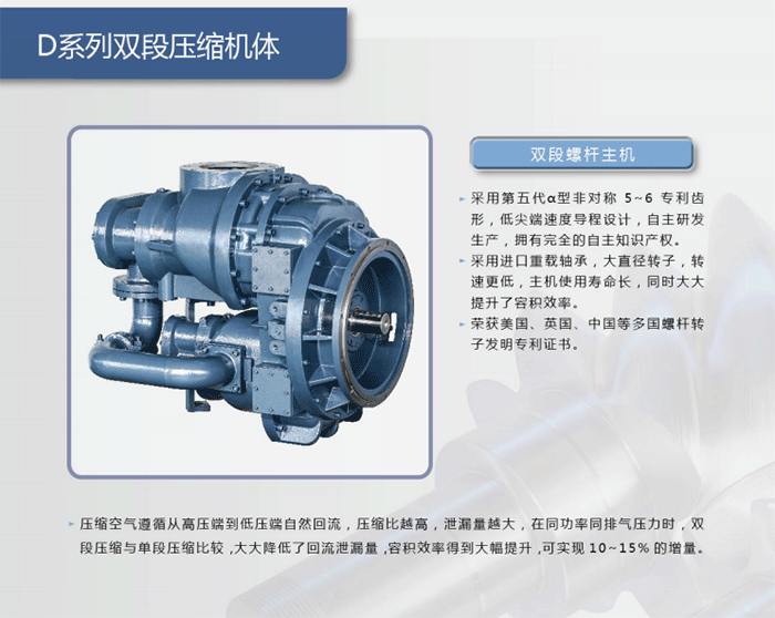 壓縮空氣遵循從高壓端到低壓端自然回流,壓縮比越高,泄漏量越大,在同功率同排氣壓力時,雙段壓縮與單段壓縮比較,大大降低了回流泄混量,容積效率得到大幅提升,可實現(xiàn)10~15%的增量。